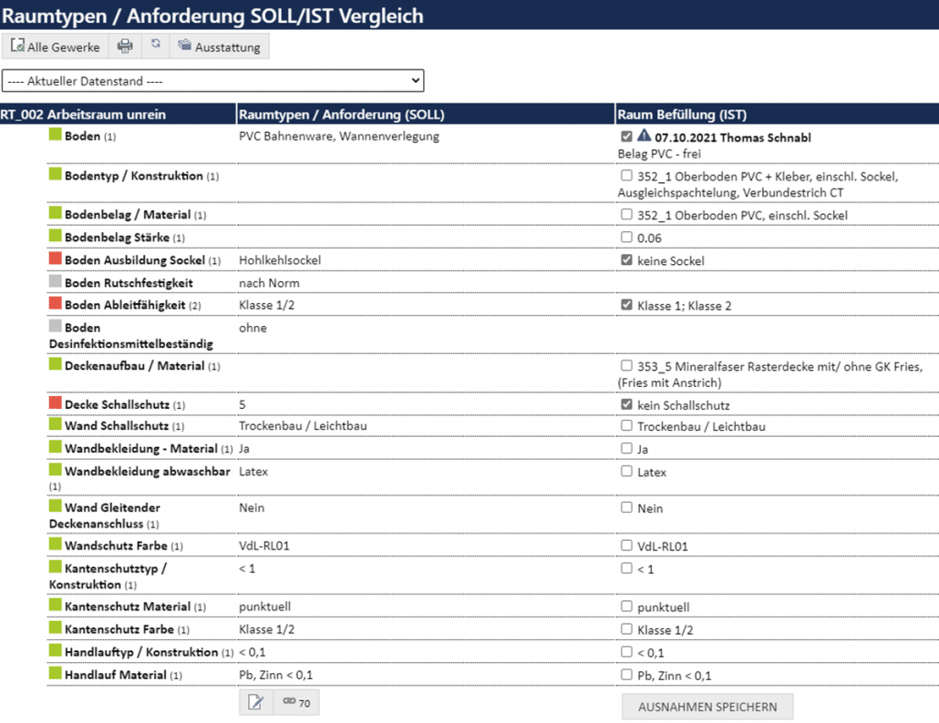 Es erfolgt ein Vergleich nach Attributen zwischen den SOLL-Anforderungen und den Daten aus der Raum-Befüllung (IST). Abweichungen werden farbig dargestellt. Eine Ausnahmenbestätigung ist möglich.